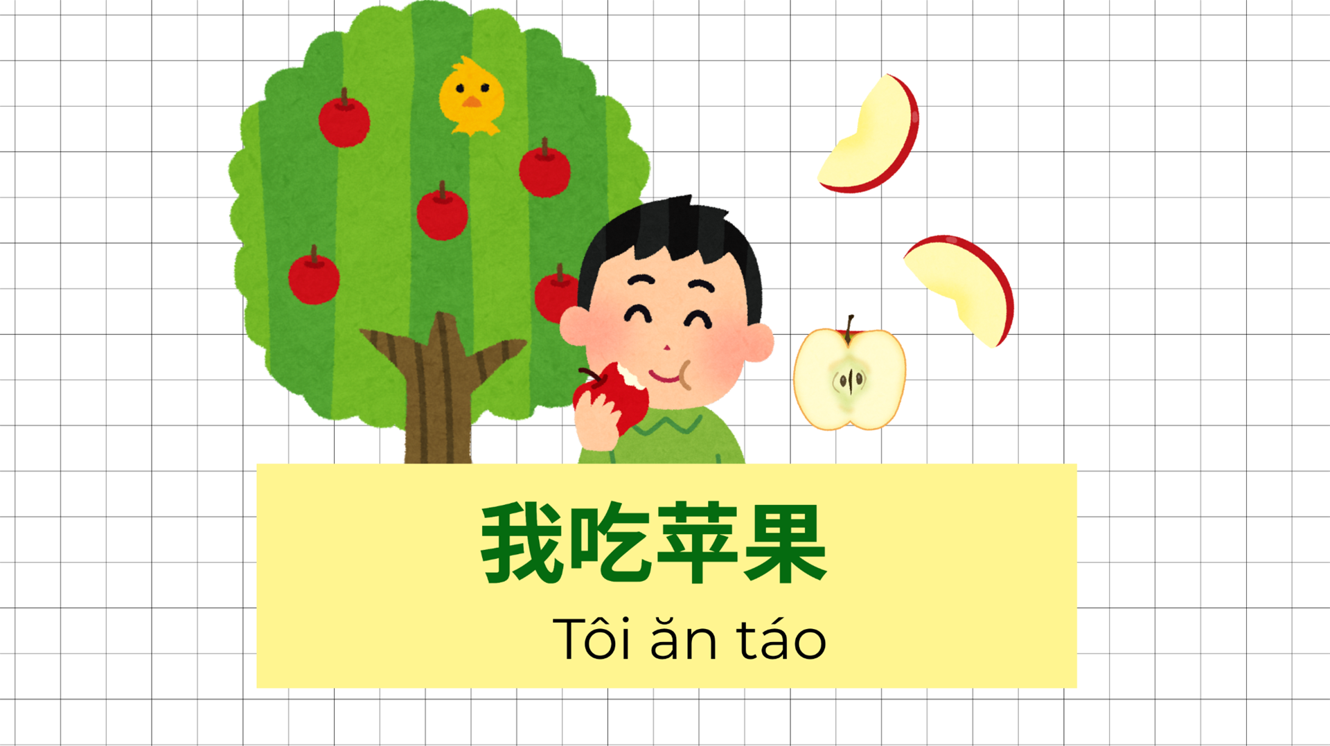 我吃苹果。Wǒ chī píngguǒ. → Tôi ăn táo.